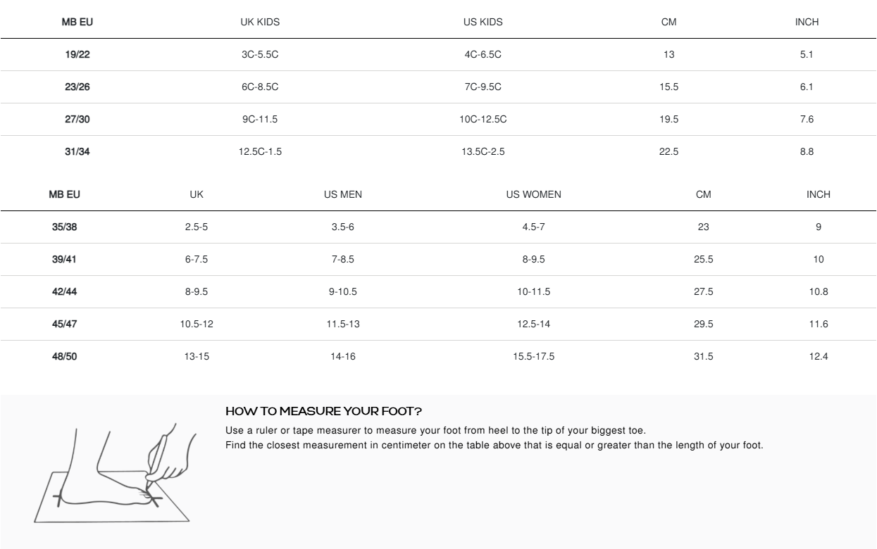 The specially designed foam lining relaxes slightly after a few hours of wear, moulding to the shape of any foot. It's adaptable and offers a secure and comfortable fit for a range of sizes. We recommend sizing up on these styles. For example, if you are usually an EU 38, choose an EU 39-41.